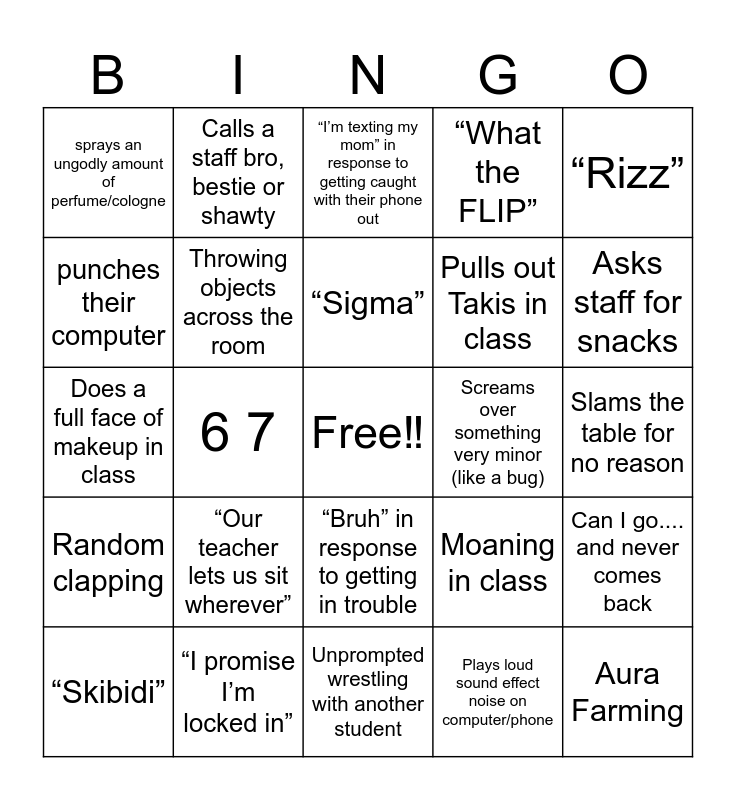 This bingo card has a free space and 24 words: “Our teacher lets us sit wherever”, “I promise I’m locked in”, “Sigma”, “Skibidi”, “Rizz”, sprays an ungodly amount of perfume/cologne, punches their computer, Calls a staff bro, bestie or shawty, Screams over something very minor (like a bug), “Bruh” in response to getting in trouble, Pulls out Takis in class, Does a full face of makeup in class, Moaning in class, Can I go.... and never comes back, Throwing objects across the room, Plays loud sound effect noise on computer/phone, Slams the table for no reason, “I’m texting my mom” in response to getting caught with their phone out, Asks staff for snacks, 6 7, Aura Farming, Random clapping, “What the FLIP” and Unprompted wrestling with another student.