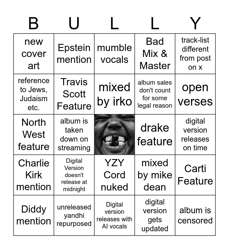 This bingo card has a free space and 24 words: Digital Version doesn't release at midnight, unreleased yandhi repurposed, mixed by irko, Diddy mention, track-list different from post on x, new cover art, reference to Jews, Judaism etc., Epstein mention, drake feature, YZY Cord nuked, album sales don't count for some legal reason, North West feature, mixed by mike dean, Carti Feature, Travis Scott Feature, digital version gets updated, digital version releases on time, mumble vocals, open verses, album is taken down on streaming, album is censored, Charlie Kirk mention, Bad Mix & Master and Digital version releases with AI vocals.