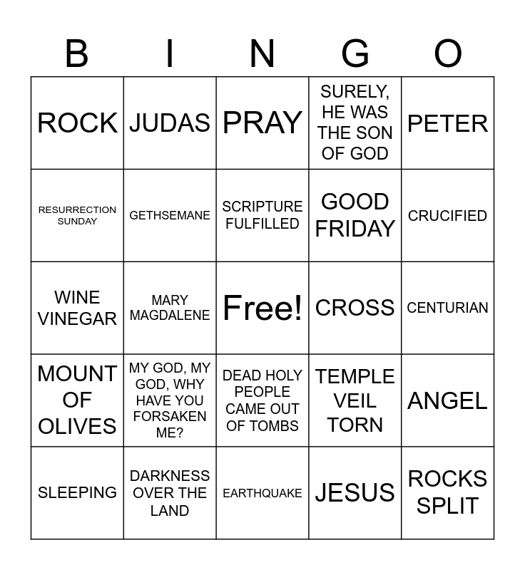 This bingo card has a free space and 34 words: GO & TELL HIS DISCIPLES, JESUS, MARK 16:15, BOOK OF MATTHEW, MOUNT OF OLIVES, GETHSEMANE, PETER, SLEEPING, JUDAS, BETRAYED WITH A KISS, SCRIPTURE FULFILLED, PRAY, GOD'S WILL, GOOD NEWS, CROSS, CRUCIFIED, DARKNESS OVER THE LAND, WINE VINEGAR, MY GOD, MY GOD, WHY HAVE YOU FORSAKEN ME?, TEMPLE VEIL TORN, DEAD HOLY PEOPLE CAME OUT OF TOMBS, TOMB, ROCK, CENTURIAN, EARTHQUAKE, ROCKS SPLIT, SURELY, HE WAS THE SON OF GOD, BIG STONE IN FRONT OF TOMB, GOOD FRIDAY, RESURRECTION SUNDAY, MARY, MARY MAGDALENE, ANGEL and DO NOT BE AFRAID.