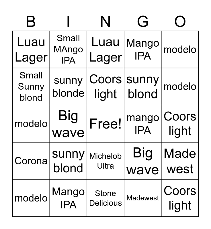 This bingo card has a free space and 29 words: modelo, Modelo, Big wave, Big Wave, Luau Lager, Luau Lager, sunny blonde, sunny blond, mango IPA, Mango IPA, Coors light, Coors light, Stone Delicious, Madewest, modelo, Corona, Michelob Ultra, Corona, modelo, modelo, Big wave, Small Big wave, sunny blond, Small Sunny blond, Mango IPA, Small MAngo IPA, Made west, Coors light and Coors light.