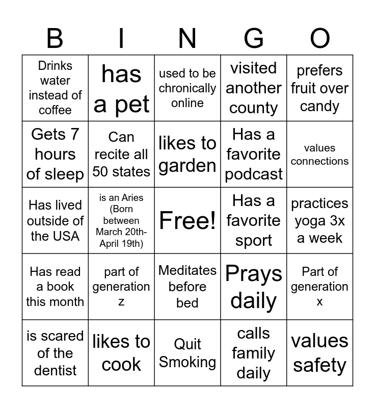 This bingo card has a free space and 24 words: part of generation z, likes to cook, likes to garden, is scared of the dentist, prefers fruit over candy, Drinks water instead of coffee, Gets 7 hours of sleep, has a pet, Has a favorite sport, Meditates before bed, Has a favorite podcast, Has lived outside of the USA, Prays daily, Part of generation x, Can recite all 50 states, calls family daily, practices yoga 3x a week, used to be chronically online, values connections, is an Aries (Born between March 20th- April 19th), values safety, Has read a book this month, visited another county and Quit Smoking.