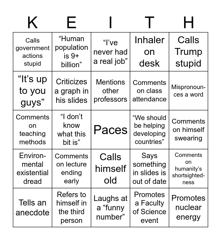 This bingo card has a free space and 39 words: Mentions his family, Says students will become millionaires, Swears, Criticizes a graph in his slides, Tells an anecdote, Calls himself old, Mentions other professors, Taps desk, Calls Trump stupid, Environ-mental existential dread, “I don’t know what this bit is”, Inhaler on desk, Promotes nuclear energy, Comments on himself swearing, “We should be helping developing countries”, Comments on lecture ending early, “Don’t ever smoke”, Calls government actions stupid, References pop culture, Says something in slides is out of date, “It’s up to you guys”, Laughs at a “funny number”, Comments on class attendance, Mispronoun-ces a word, “Canadians are wasteful”, Promotes Earth & Environmental Sciences, Criticizes wealthy people, Calls himself fat, Mentions animals dying, “Human population is 9+ billion”, Makes fun of USA, Comments on how fast he’s talking, “I’ve never had a real job”, Refers to himself in the third person, Promotes a Faculty of Science event, “I’ll be dead in a couple decades”, Comments on humanity’s shortsighted-ness, Comments on teaching methods and Uses himself/ students/ lecture hall for scale.
