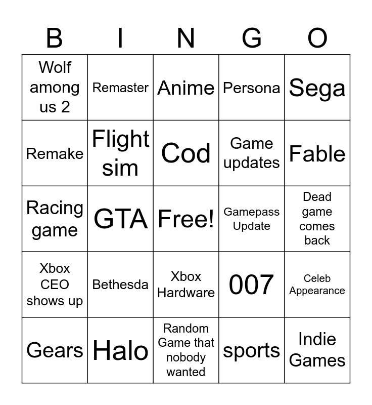 This bingo card has a free space and 24 words: Bethesda, Halo, Cod, Gears, Sega, Wolf among us 2, Remake, Remaster, Gamepass Update, Xbox Hardware, Game updates, Racing game, 007, Celeb Appearance, Flight sim, sports, Dead game comes back, Anime, Fable, GTA, Indie Games, Xbox CEO shows up, Persona and Random Game that nobody wanted.