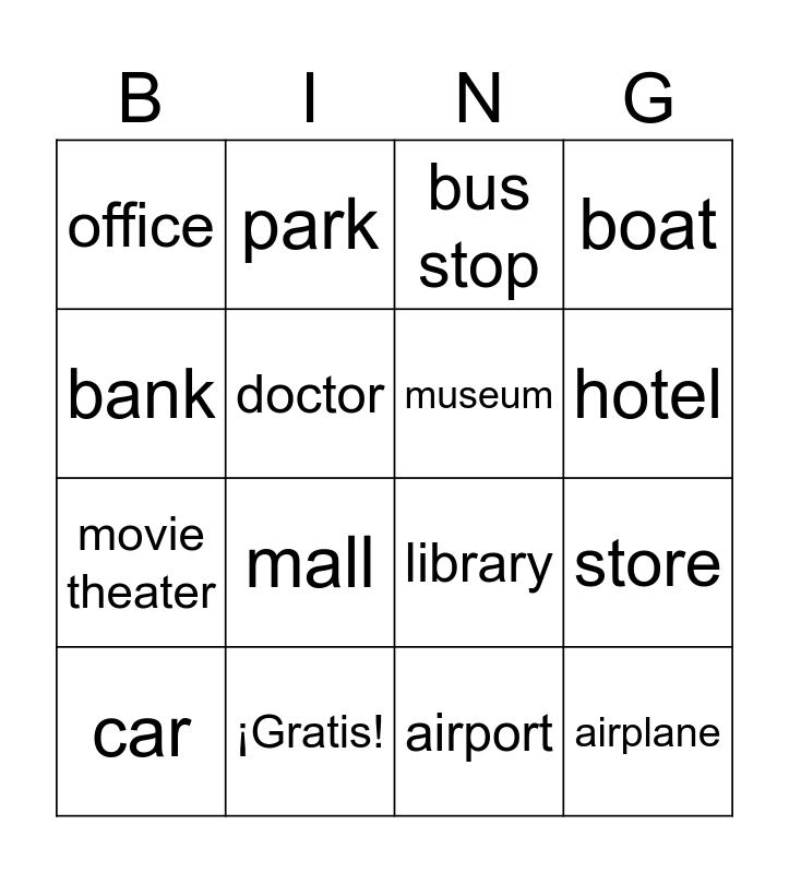 This bingo card has 25 words: city, dentist, hotel, restaurant, bank, office, doctor, park, ¡Gratis!, school, movie theater, library, party, house, museum, street, airport, bus stop, mall, store, car, bus, airplane, boat and train.