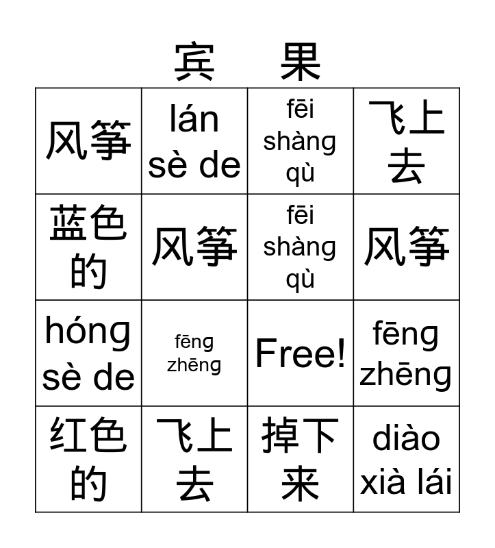 This bingo card has 16 words: 飞上 去, fēnɡ zhēnɡ, fēi shànɡ qù, 风筝, hónɡ sè de, lán sè de, Free!, 掉下 来, 蓝色 的, 风筝, 红色 的, 飞上 去, fēnɡ zhēnɡ, 风筝, fēi shànɡ qù and diào xià lái.