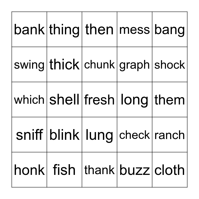 This bingo card has 25 words: blink, thank, chunk, honk, bang, bank, swing, thing, long, lung, graph, which, check, ranch, thick, cloth, them, then, shock, shell, fresh, fish, sniff, mess and buzz.