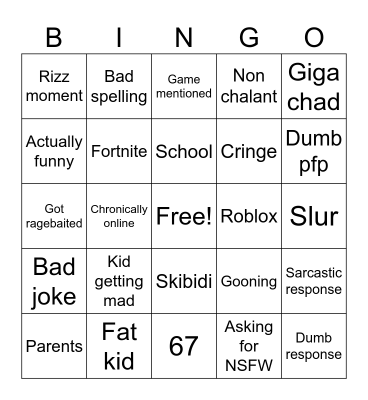 This bingo card has a free space and 24 words: Kid getting mad, Fat kid, School, Parents, Giga chad, Rizz moment, Actually funny, Bad spelling, Roblox, Skibidi, Cringe, Got ragebaited, Gooning, Sarcastic response, Fortnite, Asking for NSFW, Slur, Game mentioned, Dumb pfp, Chronically online, Dumb response, Bad joke, Non chalant and 67.