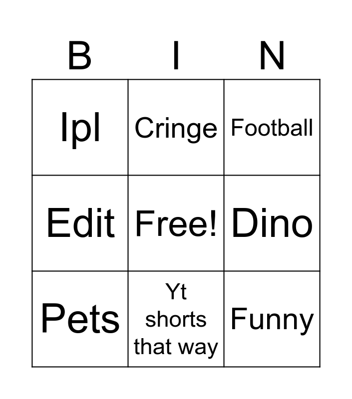 This bingo card has a free space and 10 words: Yt shorts that way, Football, Ipl, Funny, Edit, Pets, Cringe, Wong, Dino and Show.