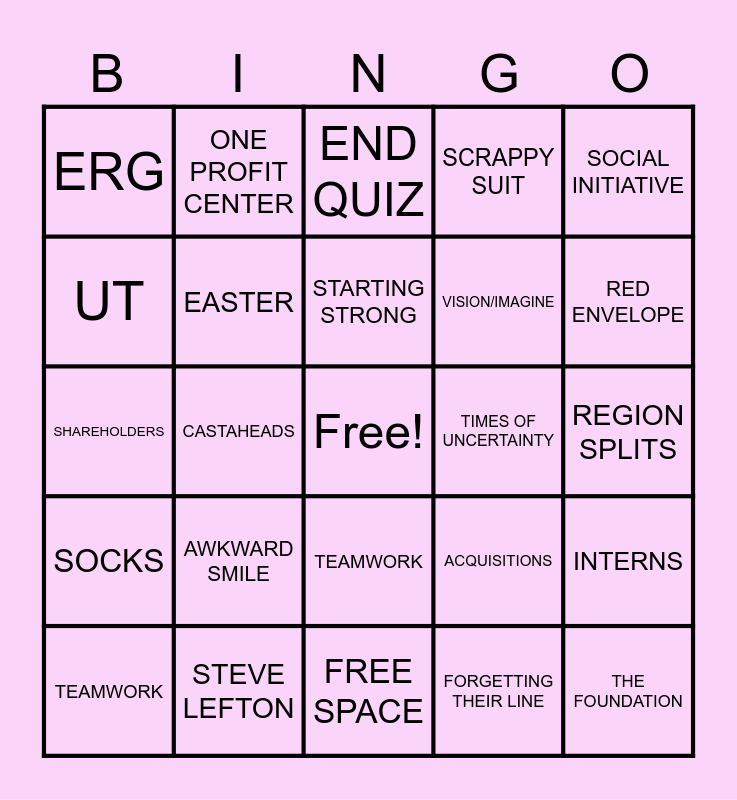 This bingo card has a free space and 24 words: AWKWARD SMILE, STEVE LEFTON, STARTING STRONG, TEAMWORK, SOCIAL INITIATIVE, ERG, UT, ONE PROFIT CENTER, TIMES OF UNCERTAINTY, TEAMWORK, VISION/IMAGINE, SHAREHOLDERS, ACQUISITIONS, INTERNS, EASTER, FORGETTING THEIR LINE, REGION SPLITS, END QUIZ, RED ENVELOPE, CASTAHEADS, THE FOUNDATION, SOCKS, SCRAPPY SUIT and FREE SPACE.