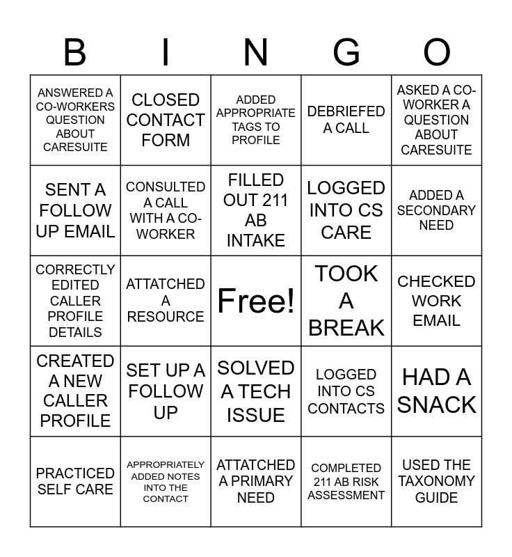 This bingo card has a free space and 24 words: SET UP A FOLLOW UP, APPROPRIATELY ADDED NOTES INTO THE CONTACT, FILLED OUT 211 AB INTAKE, PRACTICED SELF CARE, ASKED A CO-WORKER A QUESTION ABOUT CARESUITE, ANSWERED A CO-WORKERS QUESTION ABOUT CARESUITE, SENT A FOLLOW UP EMAIL, CLOSED CONTACT FORM, TOOK A BREAK, SOLVED A TECH ISSUE, LOGGED INTO CS CARE, CORRECTLY EDITED CALLER PROFILE DETAILS, LOGGED INTO CS CONTACTS, HAD A SNACK, CONSULTED A CALL WITH A CO-WORKER, COMPLETED 211 AB RISK ASSESSMENT, CHECKED WORK EMAIL, ADDED APPROPRIATE TAGS TO PROFILE, ADDED A SECONDARY NEED, ATTATCHED A RESOURCE, USED THE TAXONOMY GUIDE, CREATED A NEW CALLER PROFILE, DEBRIEFED A CALL and ATTATCHED A PRIMARY NEED.
