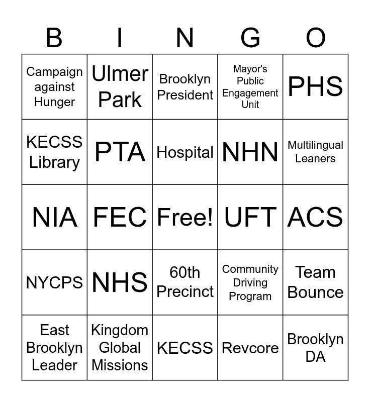 This bingo card has a free space and 26 words: 60th Precinct, Revcore, Hospital, Kingdom Global Missions, PHS, Campaign against Hunger, KECSS Library, Ulmer Park, ACS, Community Driving Program, NHN, NIA, Team Bounce, East Brooklyn Leader, FEC, KCC, Mayor's Public Engagement Unit, NYCPS, Brooklyn President, Brooklyn DA, Multilingual Leaners, KECSS, UFT, NHS, PTA and NJHS.