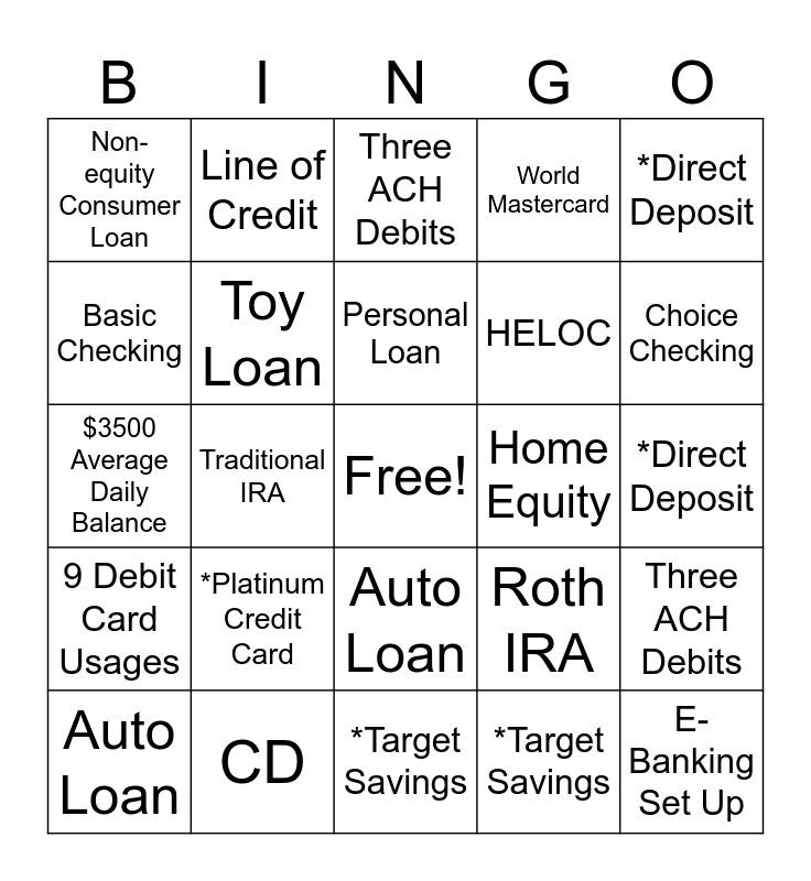 This bingo card has a free space and 24 words: *Platinum Credit Card, CD, Personal Loan, Auto Loan, *Direct Deposit, Non-equity Consumer Loan, Basic Checking, Line of Credit, Home Equity, Auto Loan, HELOC, $3500 Average Daily Balance, Roth IRA, Three ACH Debits, Toy Loan, *Target Savings, *Direct Deposit, Three ACH Debits, Choice Checking, Traditional IRA, E- Banking Set Up, 9 Debit Card Usages, World Mastercard and *Target Savings.