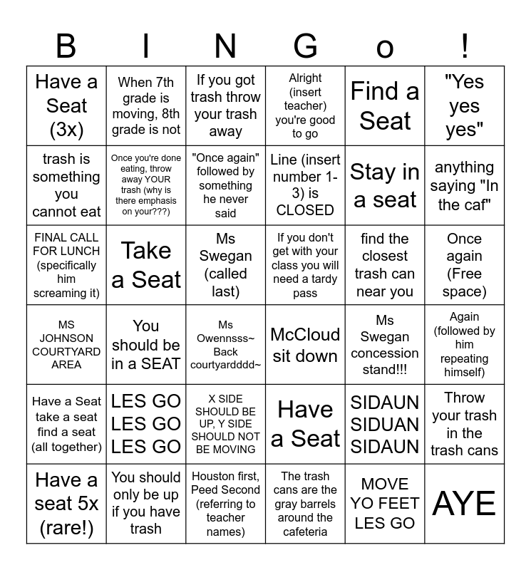This bingo card has 36 words: Have a Seat, X SIDE SHOULD BE UP, Y SIDE SHOULD NOT BE MOVING, The trash cans are the gray barrels around the cafeteria, trash is something you cannot eat, MS JOHNSON COURTYARD AREA, If you don't get with your class you will need a tardy pass, Once you're done eating, throw away YOUR trash (why is there emphasis on your???), Houston first, Peed Second (referring to teacher names), Find a Seat, SIDAUN SIDUAN SIDAUN, anything saying "In the caf", Alright (insert teacher) you're good to go, Throw your trash in the trash cans, Take a Seat, Line (insert number 1-3) is CLOSED, Have a Seat (3x), Have a Seat take a seat find a seat (all together), find the closest trash can near you, FINAL CALL FOR LUNCH (specifically him screaming it), If you got trash throw your trash away, Ms Swegan (called last), You should be in a SEAT, McCloud sit down, Ms Owennsss~ Back courtyardddd~, Ms Swegan concession stand!!!, When 7th grade is moving, 8th grade is not, Stay in a seat, You should only be up if you have trash, "Once again" followed by something he never said, "Yes yes yes", AYE, Have a seat 5x (rare!), Again (followed by him repeating himself), Once again (Free space), LES GO LES GO LES GO and MOVE YO FEET LES GO.