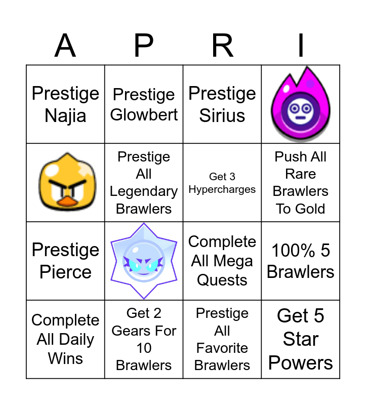 This bingo card has 3 images and 13 words: Get 2 Gears For 10 Brawlers, 100% 5 Brawlers, Prestige Sirius, Prestige Najia, Prestige Pierce, Prestige Glowbert, Complete All Mega Quests, Prestige All Favorite Brawlers, Prestige All Legendary Brawlers, Complete All Daily Wins, Push All Rare Brawlers To Gold, Get 3 Hypercharges and Get 5 Star Powers.