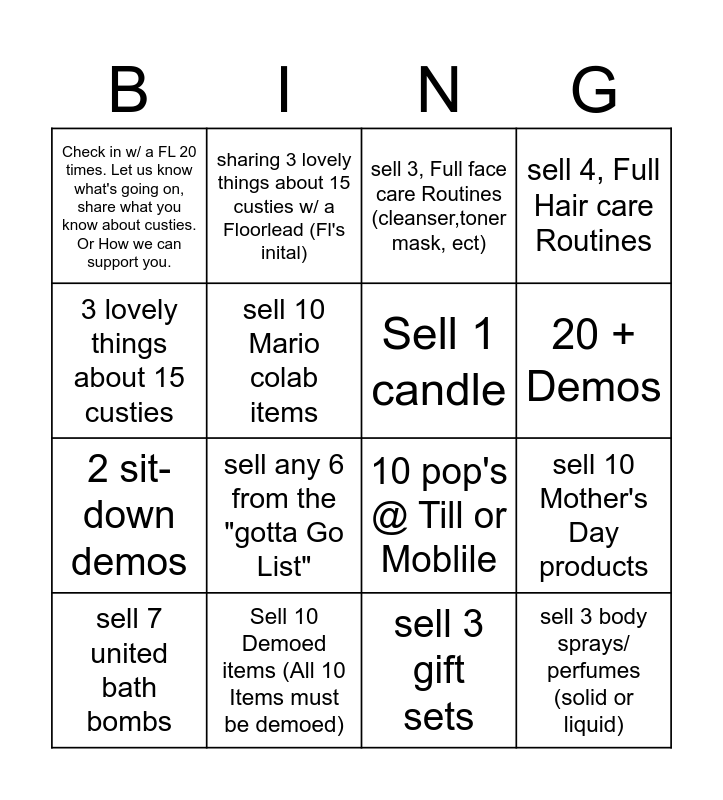This bingo card has 16 words: sell 7 united bath bombs, Sell 10 Demoed items (All 10 Items must be demoed), sell 3, Full face care Routines (cleanser,toner mask, ect), sell 4, Full Hair care Routines, 3 lovely things about 15 custies, sharing 3 lovely things about 15 custies w/ a Floorlead (Fl's inital), 10 pop's @ Till or Moblile, sell 10 Mother's Day products, Check in w/ a FL 20 times. Let us know what's going on, share what you know about custies. Or How we can support you., sell 10 Mario colab items, sell 3 gift sets, 20 + Demos, 2 sit-down demos, sell any 6 from the "gotta Go List", Sell 1 candle and sell 3 body sprays/ perfumes (solid or liquid).