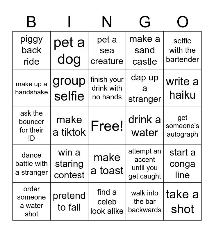 This bingo card has a free space and 24 words: win a staring contest, pretend to fall, finish your drink with no hands, order someone a water shot, selfie with the bartender, piggy back ride, make up a handshake, pet a dog, drink a water, make a toast, dap up a stranger, ask the bouncer for their ID, attempt an accent until you get caught, start a conga line, group selfie, walk into the bar backwards, get someone's autograph, pet a sea creature, write a haiku, make a tiktok, take a shot, dance battle with a stranger, make a sand castle and find a celeb look alike.