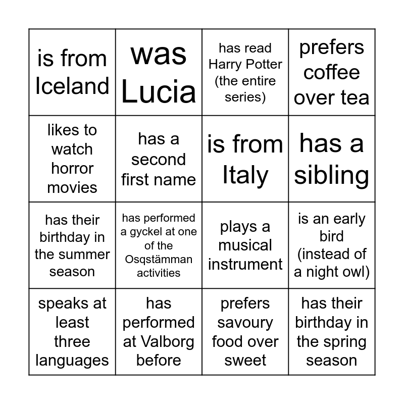 This bingo card has 22 words: has performed at Valborg before, sang in a small group during a concert, was Lucia, is also part of KTK, has a second first name, is from Italy, is from Iceland, has read Harry Potter (the entire series), plays a musical instrument, has their birthday in the spring season, has their birthday in the summer season, prefers coffee over tea, prefers tea over coffee, prefers sweet food over savoury, prefers savoury food over sweet, owns a bike, is an early bird (instead of a night owl), speaks at least three languages, has performed a gyckel at one of the Osqstämman activities, likes to watch horror movies, has a sibling and has sung karaoke before.