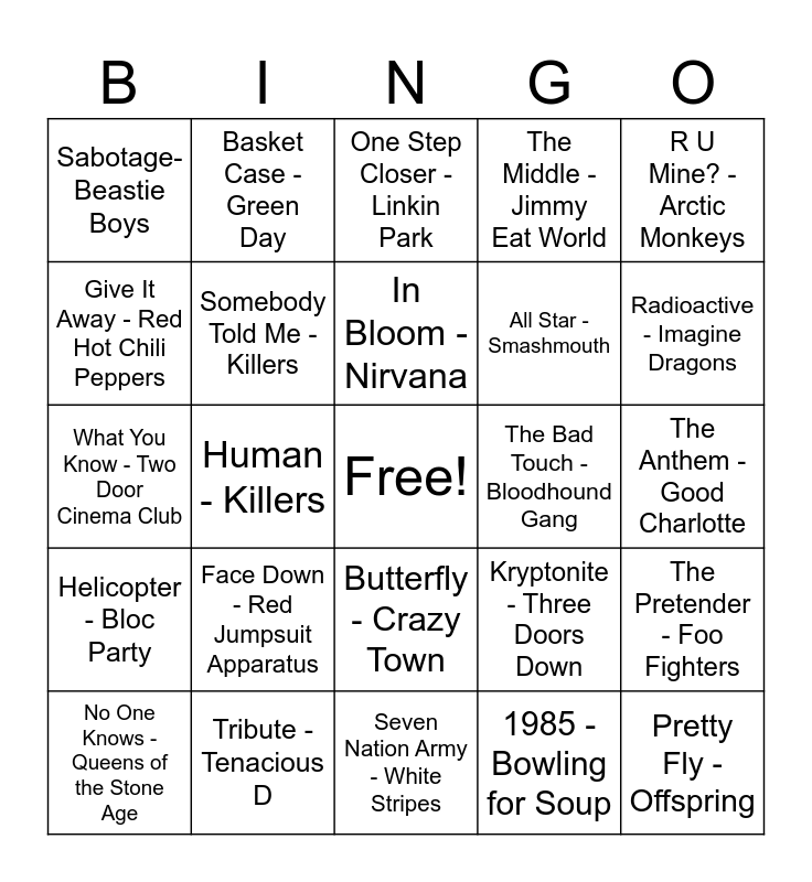 This bingo card has a free space and 36 words: Can't Stop - Red Hot Chili Peppers, Everlong - Foo Fighters, Last Night - The Strokes, Somebody Told Me - Killers, Kryptonite - Three Doors Down, Helicopter - Bloc Party, In Bloom - Nirvana, In Too Deep - Sum 41, R U Mine? - Arctic Monkeys, Monkey Wrench - Foo Fighters, Human - Killers, The Middle - Jimmy Eat World, Inside Out - Eve 6, The Bad Touch - Bloodhound Gang, Radioactive - Imagine Dragons, Sabotage- Beastie Boys, Joker and the Thief - Wolfmother, Face Down - Red Jumpsuit Apparatus, Pretty Fly - Offspring, One Step Closer - Linkin Park, The Anthem - Good Charlotte, The Pretender - Foo Fighters, Tribute - Tenacious D, No One Knows - Queens of the Stone Age, Seven Nation Army - White Stripes, Basket Case - Green Day, What You Know - Two Door Cinema Club, Ain't It Fun - Paramore, All Star - Smashmouth, Give It Away - Red Hot Chili Peppers, Woman - Wolfmother, My Own Worst Enemy - LIT, 1985 - Bowling for Soup, Butterfly - Crazy Town, In the End - Linkin Park and All the Small Things - Blink 182.
