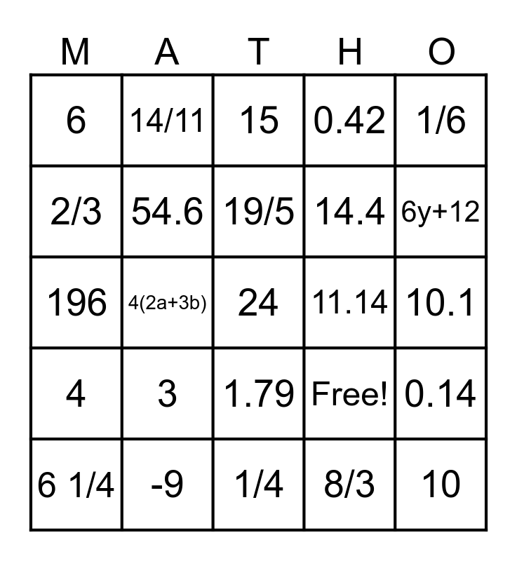 This bingo card has 25 words: 3, 1/4, 19/5, 6 1/4, 1/6, 6, 2/3, 14/11, 11.14, 1.79, 14.4, 196, Free!, 0.14, 54.6, 10, 10.1, 15, 6y+12, 4(2a+3b), 24, -9, 4, 0.42 and 8/3.