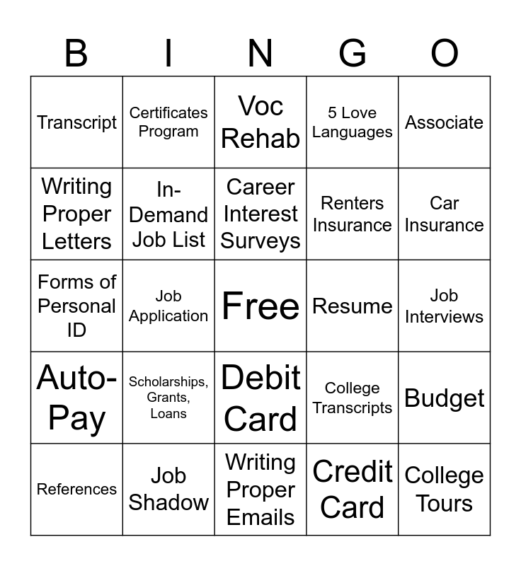 This bingo card has a free space and 24 words: Scholarships, Grants, Loans, Job Shadow, Career Interest Surveys, References, Associate, Transcript, Writing Proper Letters, Certificates Program, Resume, Debit Card, Renters Insurance, Forms of Personal ID, College Transcripts, Budget, In-Demand Job List, Credit Card, Job Interviews, Voc Rehab, Car Insurance, Job Application, College Tours, Auto-Pay, 5 Love Languages and Writing Proper Emails.