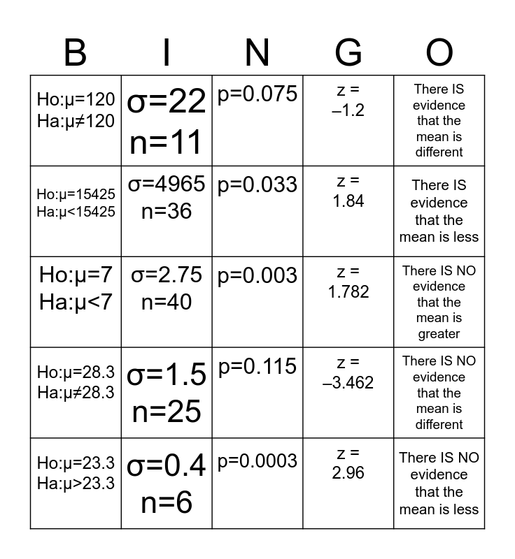 This bingo card has 25 words: Ho:μ=28.3 Ha:μ≠28.3, σ=0.4 n=6, p=0.003, z = 2.96, There IS evidence that the mean is different, Ho:μ=120 Ha:μ≠120, σ=22 n=11, p=0.075, z = 1.782, There IS NO evidence that the mean is different, Ho:μ=15425 Ha:μ<15425, σ=4965 n=36, p=0.0003, z = –3.462, There IS evidence that the mean is less, Ho:μ=23.3 Ha:μ>23.3, σ=2.75 n=40, p=0.033, z = 1.84, There IS NO evidence that the mean is greater, Ho:μ=7 Ha:μ<7, σ=1.5 n=25, p=0.115, z = –1.2 and There IS NO evidence that the mean is less.