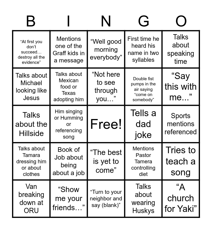 This bingo card has a free space and 24 words: Book of Job about being about a job, “Show me your friends…”, “Not here to see through you…”, Van breaking down at ORU, Talks about speaking time, “At first you don’t succeed… destroy all the evidence”, Talks about Michael looking like Jesus, Mentions one of the Graff kids in a message, Tells a dad joke, “The best is yet to come”, Double fist pumps in the air saying “come on somebody”, Talks about the Hillside, Mentions Pastor Tamera controlling diet, Tries to teach a song, Talks about Mexican food or Texas adopting him, Talks about wearing Huskys, Sports mentions referenced, “Well good morning everybody”, “Say this with me...”, Him singing or Humming or referencing song, “A church for Yaki”, Talks about Tamara dressing him or about clothes, First time he heard his name in two syllables and “Turn to your neighbor and say (blank)”.