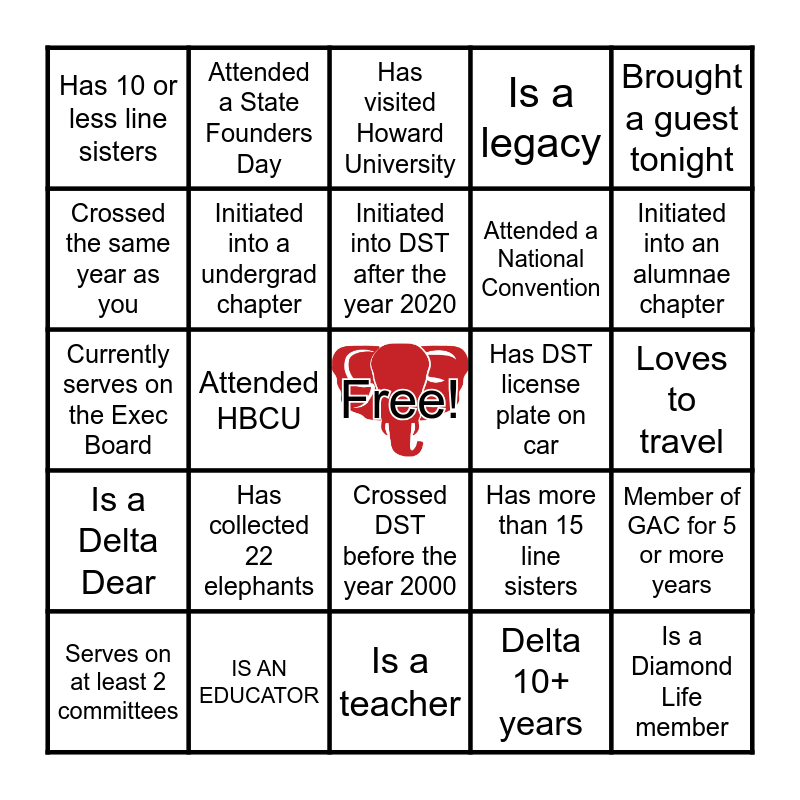This bingo card has a free space and 24 words: Has collected 22 elephants, IS AN EDUCATOR, Initiated into DST after the year 2020, Serves on at least 2 committees, Brought a guest tonight, Has 10 or less line sisters, Crossed the same year as you, Attended a State Founders Day, Has DST license plate on car, Crossed DST before the year 2000, Attended a National Convention, Currently serves on the Exec Board, Has more than 15 line sisters, Member of GAC for 5 or more years, Initiated into a undergrad chapter, Delta 10+ years, Loves to travel, Has visited Howard University, Initiated into an alumnae chapter, Attended HBCU, Is a Diamond Life member, Is a Delta Dear, Is a legacy and Is a teacher.