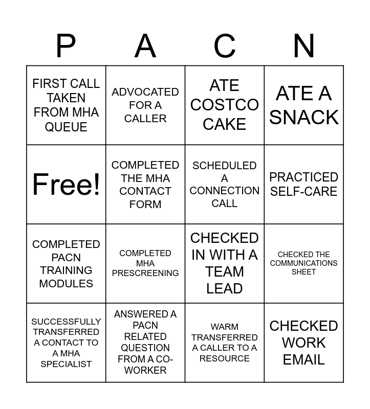 This bingo card has 16 words: ANSWERED A PACN RELATED QUESTION FROM A CO-WORKER, CHECKED THE COMMUNICATIONS SHEET, ATE COSTCO CAKE, FIRST CALL TAKEN FROM MHA QUEUE, COMPLETED PACN TRAINING MODULES, ADVOCATED FOR A CALLER, CHECKED IN WITH A TEAM LEAD, WARM TRANSFERRED A CALLER TO A RESOURCE, Free!, COMPLETED THE MHA CONTACT FORM, SUCCESSFULLY TRANSFERRED A CONTACT TO A MHA SPECIALIST, ATE A SNACK, COMPLETED MHA PRESCREENING, PRACTICED SELF-CARE, SCHEDULED A CONNECTION CALL and CHECKED WORK EMAIL.