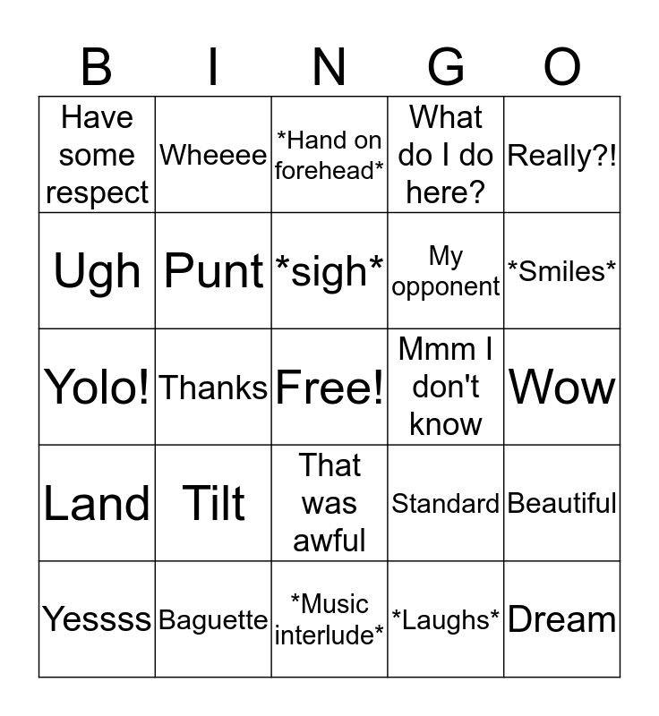 This bingo card has a free space and 24 words: Tilt, Baguette, *sigh*, Yessss, Really?!, Have some respect, Ugh, Wheeee, Mmm I don't know, That was awful, My opponent, Yolo!, Standard, Beautiful, Punt, *Laughs*, Wow, *Hand on forehead*, *Smiles*, Thanks, Dream, Land, What do I do here? and *Music interlude*.