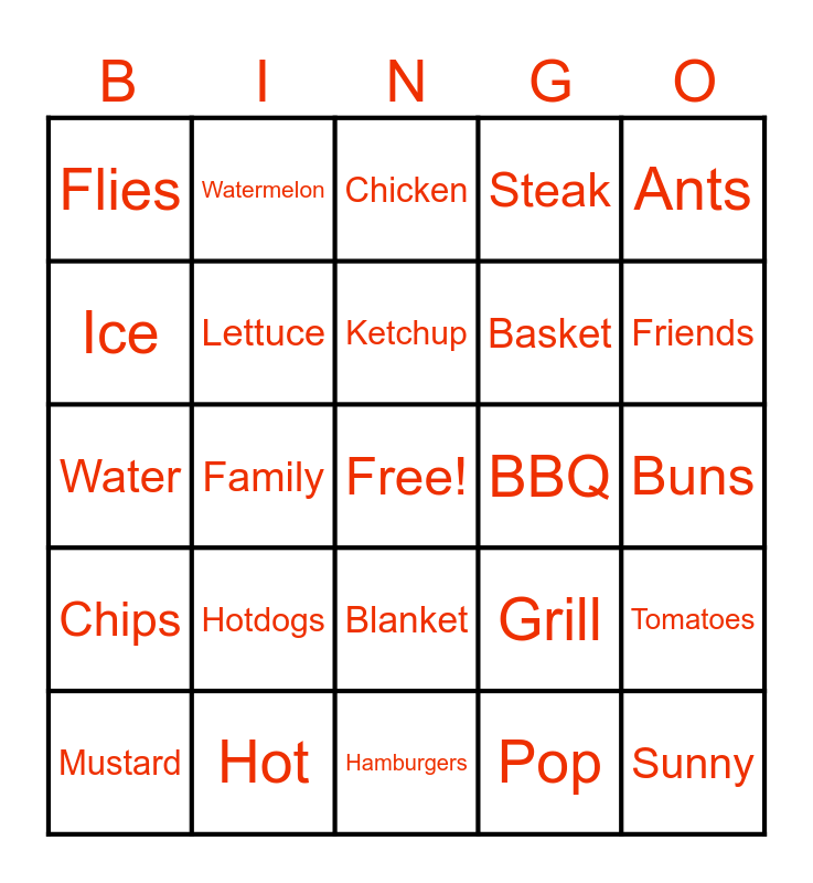 This bingo card has a free space and 25 words: Hotdogs, Hamburgers, Ketchup, Mustard, Ants, Flies, Ice, Watermelon, BBQ, Blanket, Basket, Water, Grill, Tomatoes, Lettuce, Onions, Buns, Chicken, Friends, Family, Sunny, Hot, Chips, Steak and Pop.