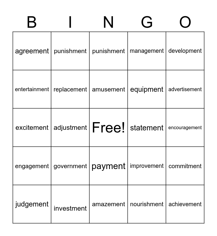 This bingo card has a free space and 24 words: government, investment, amusement, judgement, development, agreement, entertainment, punishment, statement, payment, equipment, excitement, improvement, commitment, replacement, nourishment, encouragement, punishment, advertisement, adjustment, achievement, engagement, management and amazement.