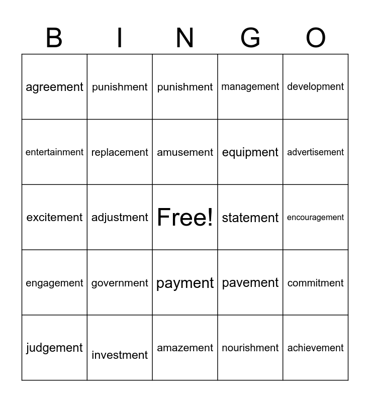 This bingo card has a free space and 24 words: government, investment, amusement, judgement, development, agreement, entertainment, punishment, statement, payment, equipment, excitement, pavement, commitment, replacement, nourishment, encouragement, punishment, advertisement, adjustment, achievement, engagement, management and amazement.
