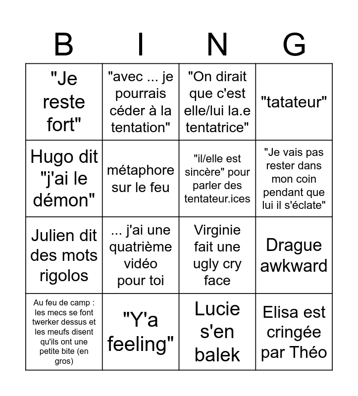 This bingo card has 16 words: "Y'a feeling", Drague awkward, "On dirait que c'est elle/lui la.e tentatrice", "Je reste fort", Julien dit des mots rigolos, "avec ... je pourrais céder à la tentation", Virginie fait une ugly cry face, Lucie s'en balek, Hugo dit "j'ai le démon", métaphore sur le feu, Au feu de camp : les mecs se font twerker dessus et les meufs disent qu'ils ont une petite bite (en gros), "tatateur", ... j'ai une quatrième vidéo pour toi, "Je vais pas rester dans mon coin pendant que lui il s'éclate", "il/elle est sincère" pour parler des tentateur.ices and Elisa est cringée par Théo.