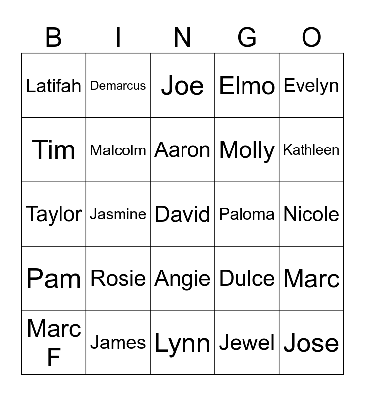 This bingo card has a free space and 24 words: Rosie, James, Aaron, Marc F, Evelyn, Latifah, Tim, Demarcus, Paloma, Angie, Molly, Taylor, Dulce, Marc, Malcolm, Jewel, Nicole, Joe, Kathleen, Jasmine, Jose, Pam, Elmo and Lynn.