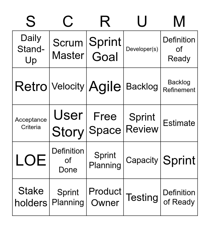 This bingo card has a free space and 27 words: Capacity, Story Points, Backlog, Product Owner, Retro, Sprint Goal, Scrum Master, LOE, Sprint Review, Sprint, Acceptance Criteria, Developer(s), Stake holders, Sprint Planning, Backlog Refinement, Burn down, Velocity, Agile, Definition of Done, Daily Stand-Up, Estimate, Testing, User Story, Definition of Ready, Sprint Planning, Definition of Ready and Estimation Factors.