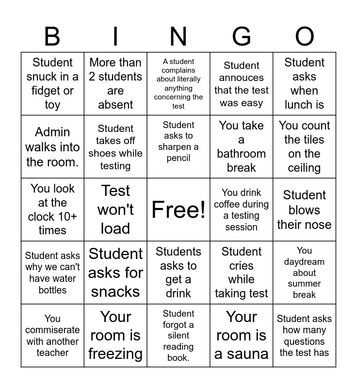 This bingo card has a free space and 39 words: Student asks to go to the bathroom more than 2x in a session, Student falls asleep, Student farts or burps in the middle of the test., Student takes off shoes while testing, You commiserate with another teacher, Students asks to get a drink, Student asks to sharpen a pencil, You eat a snack, Student asks when lunch is, Student asks why we can't have water bottles, Test won't load, Student annouces that the test was easy, Student asks how many questions the test has, Student blows their nose, You drink coffee during a testing session, Student asks for snacks, Someone finishes in less than 15 minutes, Student snuck in a fidget or toy, A student yells in the hallway, Student cries while taking test, Admin walks into the room., Student forgot a silent reading book., You take a bathroom break, You count the tiles on the ceiling, Student goes to see the nurse, You play a game (Crossword or Word Search), Phone Call from Office, You read a book, Someone at your classroom door, More than 2 students are absent, A student asks how much time is left, A student looks PANICKED over a question, A student complains about literally anything concerning the test, Your room is freezing, Your room is a sauna, Student says CMAS is pointless, You daydream about summer break, You look at the clock 10+ times and You hit your step goal before the end of the session.