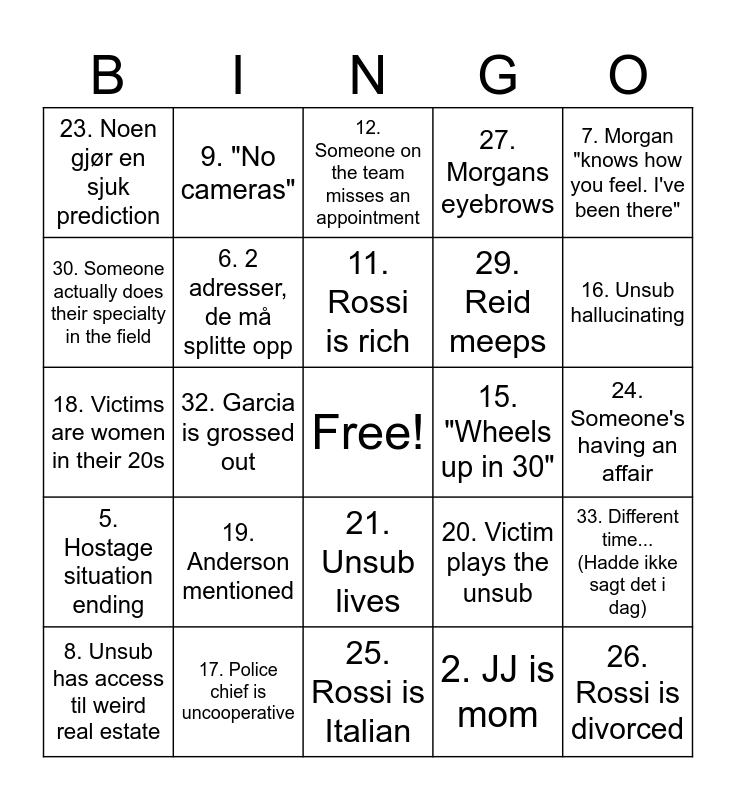 This bingo card has a free space and 34 words: 1. "This kinda thing doesn't happen here", 2. JJ is mom, 3. Unsub is hacker genius, 4. Garcia is on speaker, 5. Hostage situation ending, 6. 2 adresser, de må splitte opp, 7. Morgan "knows how you feel. I've been there", 8. Unsub has access til weird real estate, 9. "No cameras", 10. Unsub is white male in his thirties, 11. Rossi is rich, 12. Someone on the team misses an appointment, 13. Reid goes on a tangent, 14. Hotch staredown, 15. "Wheels up in 30", 16. Unsub hallucinating, 17. Police chief is uncooperative, 18. Victims are women in their 20s, 19. Anderson mentioned, 20. Victim plays the unsub, 21. Unsub lives, 22. Unsub dies, 23. Noen gjør en sjuk prediction, 24. Someone's having an affair, 25. Rossi is Italian, 26. Rossi is divorced, 27. Morgans eyebrows, 28. Morgan Kicks down a door, 29. Reid meeps, 30. Someone actually does their specialty in the field, 31. Unsub is impotent, 32. Garcia is grossed out, 33. Different time... (Hadde ikke sagt det i dag) and 34. It's personal.