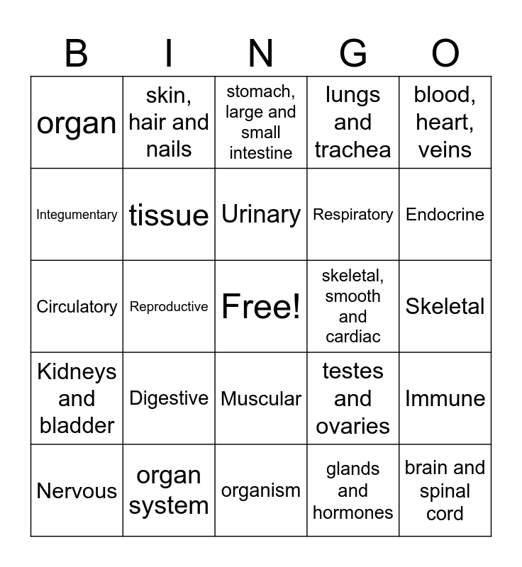 This bingo card has a free space and 26 words: Muscular, glands and hormones, Urinary, organ system, blood, heart, veins, organ, Integumentary, skin, hair and nails, Skeletal, testes and ovaries, Respiratory, Circulatory, Immune, Nervous, Reproductive, Bones and ligaments, lungs and trachea, Kidneys and bladder, stomach, large and small intestine, brain and spinal cord, Endocrine, organism, skeletal, smooth and cardiac, Digestive, tissue and cell.