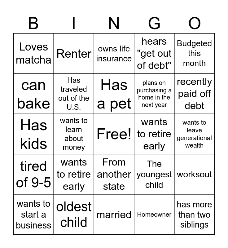 This bingo card has a free space and 24 words: wants to retire early, oldest child, Has a pet, wants to start a business, Budgeted this month, Loves matcha, can bake, Renter, wants to retire early, From another state, plans on purchasing a home in the next year, Has kids, The youngest child, worksout, Has traveled out of the U.S., Homeowner, wants to leave generational wealth, owns life insurance, recently paid off debt, wants to learn about money, has more than two siblings, tired of 9-5, hears "get out of debt" and married.