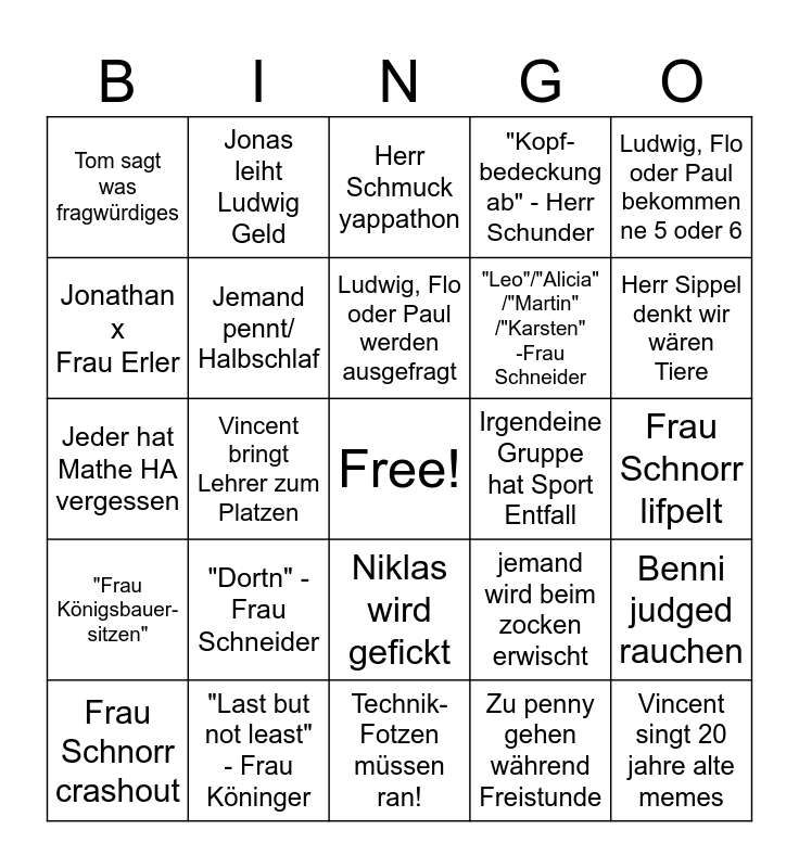 This bingo card has a free space and 24 words: "Dortn" -Frau Schneider, "Last but not least" - Frau Köninger, Ludwig, Flo oder Paul werden ausgefragt, Frau Schnorr crashout, Ludwig, Flo oder Paul bekommen ne 5 oder 6, Tom sagt was fragwürdiges, Jonathan x Frau Erler, Jonas leiht Ludwig Geld, Irgendeine Gruppe hat Sport Entfall, Niklas wird gefickt, "Leo"/"Alicia" /"Martin" /"Karsten" -Frau Schneider, Jeder hat Mathe HA vergessen, jemand wird beim zocken erwischt, Benni judged rauchen, Jemand pennt/ Halbschlaf, Zu penny gehen während Freistunde, Frau Schnorr lifpelt, Herr Schmuck yappathon, Herr Sippel denkt wir wären Tiere, Vincent bringt Lehrer zum Platzen, Vincent singt 20 jahre alte memes, "Frau Königsbauer-sitzen", "Kopf-bedeckung ab" - Herr Schunder and Technik-Fotzen müssen ran!.