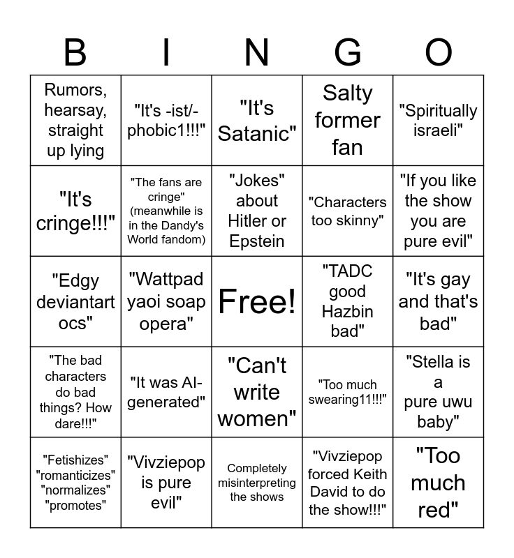 This bingo card has a free space and 24 words: "It was AI-generated", "Vivziepop is pure evil", "Jokes" about Hitler or Epstein, "Fetishizes" "romanticizes" "normalizes" "promotes", "Spiritually israeli", Rumors, hearsay, straight up lying, "It's cringe!!!", "It's -ist/-phobic1!!!", "TADC good Hazbin bad", "Can't write women", "Characters too skinny", "Edgy deviantart ocs", "Too much swearing11!!!", "Stella is a pure uwu baby", "The fans are cringe" (meanwhile is in the Dandy's World fandom), "Vivziepop forced Keith David to do the show!!!", "It's gay and that's bad", "It's Satanic", "If you like the show you are pure evil", "Wattpad yaoi soap opera", "Too much red", "The bad characters do bad things? How dare!!!", Salty former fan and Completely misinterpreting the shows.