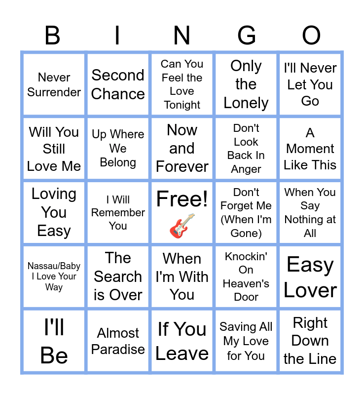 This bingo card has a free space and 24 words: The Search is Over, Almost Paradise, Now and Forever, I'll Be, I'll Never Let You Go, Never Surrender, Will You Still Love Me, Second Chance, Don't Forget Me (When I'm Gone), When I'm With You, Don't Look Back In Anger, Loving You Easy, Knockin' On Heaven's Door, Easy Lover, Up Where We Belong, Saving All My Love for You, When You Say Nothing at All, Can You Feel the Love Tonight, A Moment Like This, I Will Remember You, Right Down the Line, Nassau/Baby I Love Your Way, Only the Lonely and If You Leave.