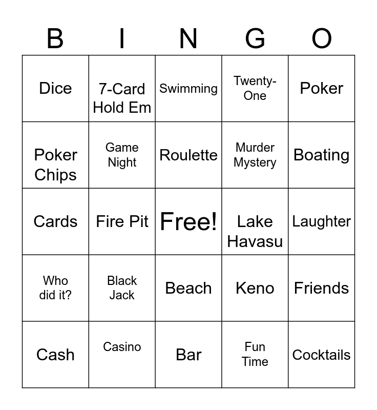 This bingo card has a free space and 24 words: Black Jack, Casino, Roulette, Cash, Poker, Dice, Poker Chips, 7-Card Hold Em, Lake Havasu, Beach, Murder Mystery, Cards, Keno, Friends, Game Night, Fun Time, Laughter, Swimming, Boating, Fire Pit, Cocktails, Who did it?, Twenty-One and Bar.