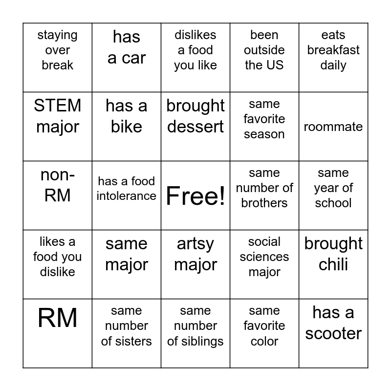This bingo card has a free space and 24 words: same major, same number of sisters, brought dessert, RM, eats breakfast daily, staying over break, STEM major, has a car, same number of brothers, artsy major, same favorite season, non-RM, social sciences major, brought chili, has a bike, same favorite color, same year of school, dislikes a food you like, roommate, has a food intolerance, has a scooter, likes a food you dislike, been outside the US and same number of siblings.