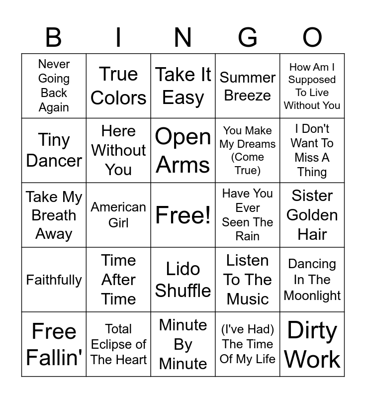This bingo card has a free space and 34 words: Kiss From A Rose, (I've Had) The Time Of My Life, I Still Haven't Found What I'm Looking For, The First Cut Is The Deepest, Faithfully, Here Without You, How Am I Supposed To Live Without You, Free Fallin', True Colors, What's Love Got To Do With It, Open Arms, Take It Easy, Jack & Diane, Can't Fight This Feeling, Have You Ever Seen The Rain, I Don't Want To Miss A Thing, Total Eclipse of The Heart, Take My Breath Away, Time After Time, Listen To The Music, Lido Shuffle, Show Me The Way, Never Going Back Again, Sister Golden Hair, Minute By Minute, Dirty Work, Summer Breeze, Miss Sun, You Make My Dreams (Come True), Tiny Dancer, Sultans Of Swing, American Girl, Dancing In The Moonlight and Get Outta My Dreams, Get Into My Car.