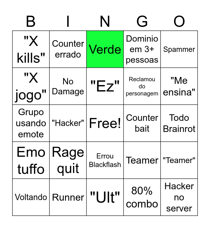 This bingo card has a free space and 24 words: Rage quit, Runner, "Ez", Voltando, Spammer, "X kills", "X jogo", Counter errado, Counter bait, Errou Blackflash, Reclamou do personagem, Grupo usando emote, Teamer, "Teamer", No Damage, 80% combo, Todo Brainrot, Verde, "Me ensina", "Hacker", Hacker no server, Emo tuffo, Dominio em 3+ pessoas and "Ult".