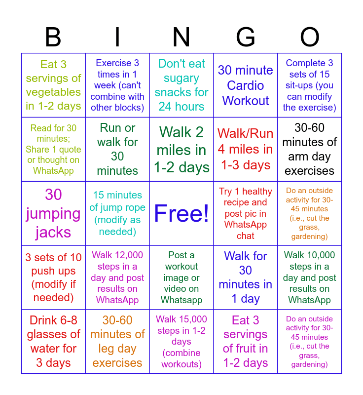 This bingo card has a free space and 24 words: Drink 6-8 glasses of water for 3 days, Walk 12,000 steps in a day and post results on WhatsApp, Walk 2 miles in 1-2 days, Eat 3 servings of fruit in 1-2 days, Complete 3 sets of 15 sit-ups (you can modify the exercise), Eat 3 servings of vegetables in 1-2 days, Exercise 3 times in 1 week (can't combine with other blocks), Don't eat sugary snacks for 24 hours, Try 1 healthy recipe and post pic in WhatsApp chat, Do an outside activity for 30-45 minutes (i.e., cut the grass, gardening), 30 jumping jacks, Run or walk for 30 minutes, Walk for 30 minutes in 1 day, Walk 10,000 steps in a day and post results on WhatsApp, Read for 30 minutes; Share 1 quote or thought on WhatsApp, 30-60 minutes of leg day exercises, Walk 15,000 steps in 1-2 days (combine workouts), 30 minute Cardio Workout, 30-60 minutes of arm day exercises, 3 sets of 10 push ups (modify if needed), 15 minutes of jump rope (modify as needed), Post a workout image or video on Whatsapp, Walk/Run 4 miles in 1-3 days and Do an outside activity for 30-45 minutes (i.e., cut the grass, gardening).