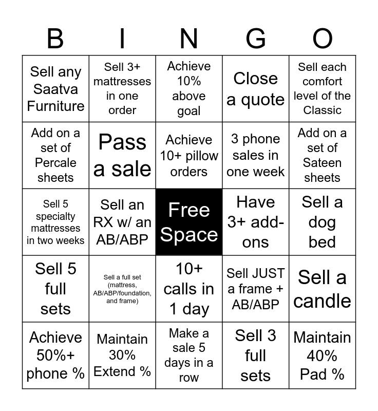 This bingo card has a free space and 24 words: Sell a full set (mattress, AB/ABP/foundation, and frame), Maintain 30% Extend %, Achieve 10+ pillow orders, Achieve 50%+ phone %, Sell each comfort level of the Classic, Sell any Saatva Furniture, Add on a set of Percale sheets, Sell 3+ mattresses in one order, Have 3+ add-ons, 10+ calls in 1 day, 3 phone sales in one week, Sell 5 specialty mattresses in two weeks, Sell JUST a frame + AB/ABP, Sell a candle, Pass a sale, Sell 3 full sets, Sell a dog bed, Achieve 10% above goal, Add on a set of Sateen sheets, Sell an RX w/ an AB/ABP, Maintain 40% Pad %, Sell 5 full sets, Close a quote and Make a sale 5 days in a row.