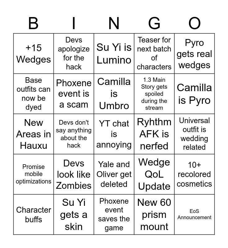This bingo card has a free space and 24 words: Devs look like Zombies, Su Yi gets a skin, Camilla is Umbro, Character buffs, Pyro gets real wedges, +15 Wedges, Base outfits can now be dyed, Devs apologize for the hack, Ryhthm AFK is nerfed, Yale and Oliver get deleted, 1.3 Main Story gets spoiled during the stream, New Areas in Hauxu, Wedge QoL Update, 10+ recolored cosmetics, Phoxene event is a scam, New 60 prism mount, Universal outfit is wedding related, Su Yi is Lumino, Camilla is Pyro, Devs don't say anything about the hack, EoS Announcement, Promise mobile optimizations, Teaser for next batch of characters and Phoxene event saves the game.