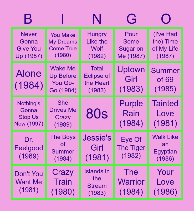 This bingo card has a free space and 81 words: The Message (1982), Billie Jean (1982), Hungry Like the Wolf (1982), Running Up That Hill (1985), What’s Love Got to Do With It (1984), Girls Just Wanna Have Fun (1983), Karma Chameleon (1983), Super Freak (1981), Sexual Healing (1982), Push It (1988), Master of Puppets (1986), I Love Rock & Roll (1980), Pour Some Sugar on Me (1987), Never Gonna Give You Up (1987), Jump (1984), Alone (1984), Here I Go Again (1987), The Boys of Summer (1984), Take My Breath Away (1986), Tainted Love (1981), Don't Stop Believin' (1981), (I've Had the) Time of My Life (1987), Nothing's Gonna Stop Us Now (1997), Total Eclipse of the Heart (1983), Wake Me Up Before You Go-Go (1984), Fast Car (1988), Sweet Child o' Mine (1988), Eternal Flame (1988), Don't You Forget About Me (1985), Livin' on a Prayer (1986), Summer of 69 (1985), The Power of Love (1985), Islands in the Stream (1983), Take on Me (1985), Don't You Want Me (1981), Purple Rain (1984), All Night Long (1983), I Wanna Dance With Somebody (1987), Africa (1982), Come on Eileen (1982), Your Love (1986), Walking on Sunshine (1983), Into The Groove (1985), Once In a Lifetime (1981), She Drives Me Crazy (1989), Everywhere (1987), You Make My Dreams Come True (1980), Heaven Is A Place on Earth (1987), Got My Mind Set On You (1987), Kiss (1986), Eye Of The Tiger (1982), Walk Like an Egyptian (1986), Call Me (1980), How Will I Know (1985), Bust A Move (1989), Who Can It Be Now? (1981), Walk This Way (1986), Kids In America (1981), Upside Down (1980), Tell It To My Heart (1988), Jessie's Girl (1981), Centerfold (1981), Conga (1985), Addicted To Love (1985), The Power Of Love (1985), Get Out Of My Dreams, Get Into My Car (1988), Love Shack (1989), Home Sweet Home (1985), Born In The USA (1984), Ghostbusters (1984), Stop Draggin' My Heart Around (1981), Dr. Feelgood (1989), Crazy Train (1980), 9-5 (1980), Forever and Ever, Amen (1987), Footloose (1984), Forever Young (1984), The Warrior (1984), Free Fallin' (1989), Uptown Girl (1983) and What A Feeling (1983).